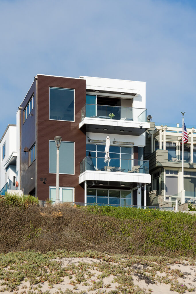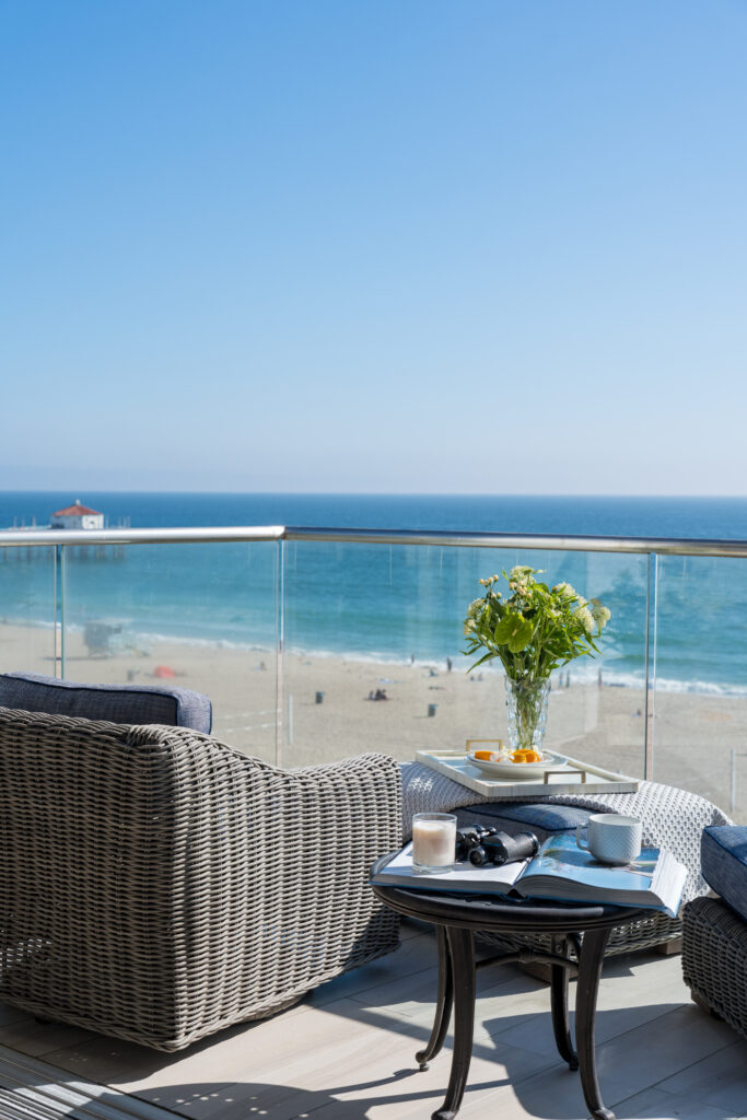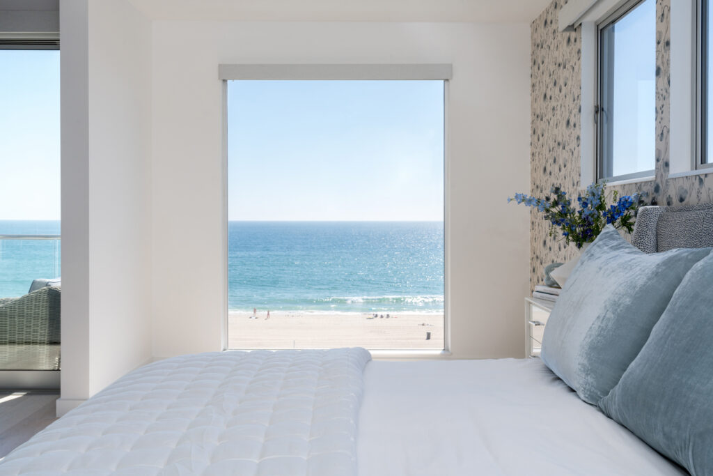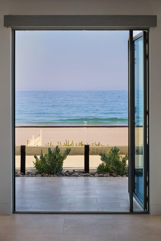 Vitale, who specializes in interior design of custom homes, made some of the architectural decisions for the renovation of the Manhattan Beach house, located on the boardwalk known as The Strand. But most of the work was a full interior renovation. She also relied on the home’s spectacular views of the ocean, visible from the kitchen, dining room, living room, and primary bedroom. “We got innovative,” she says.