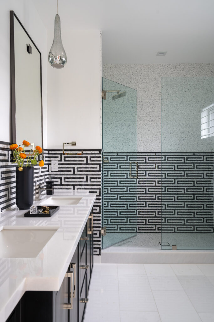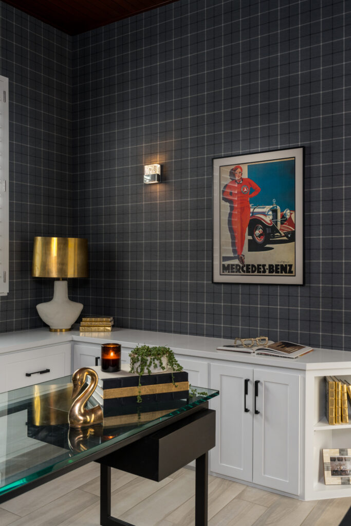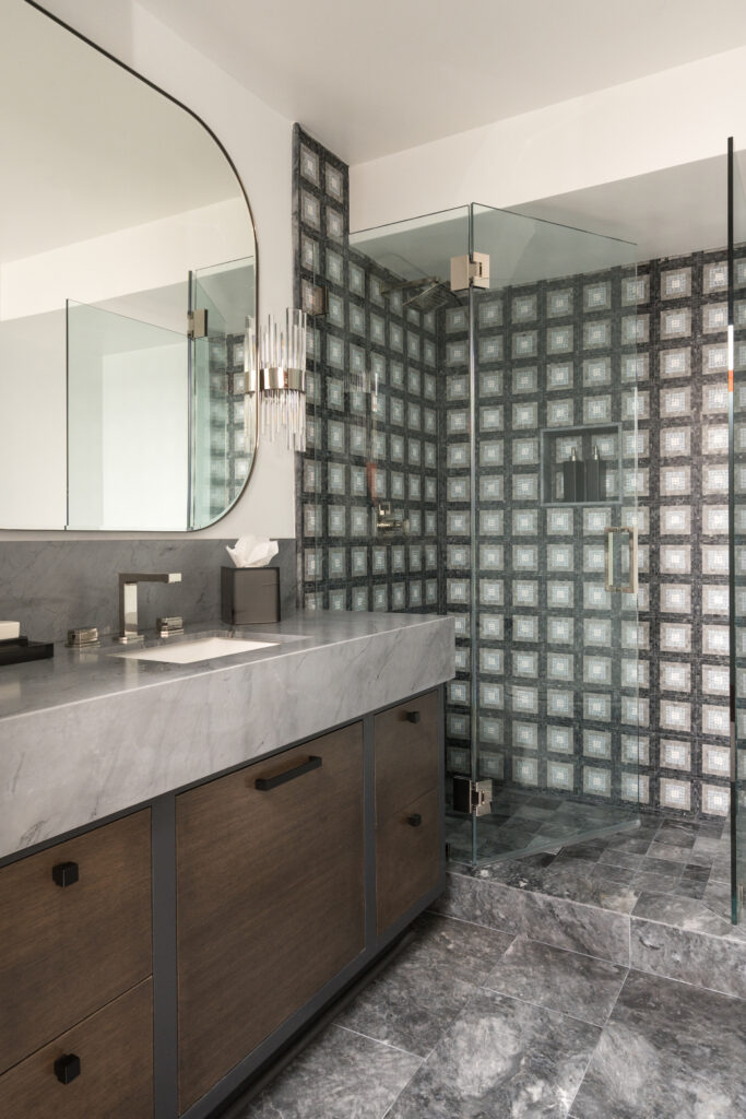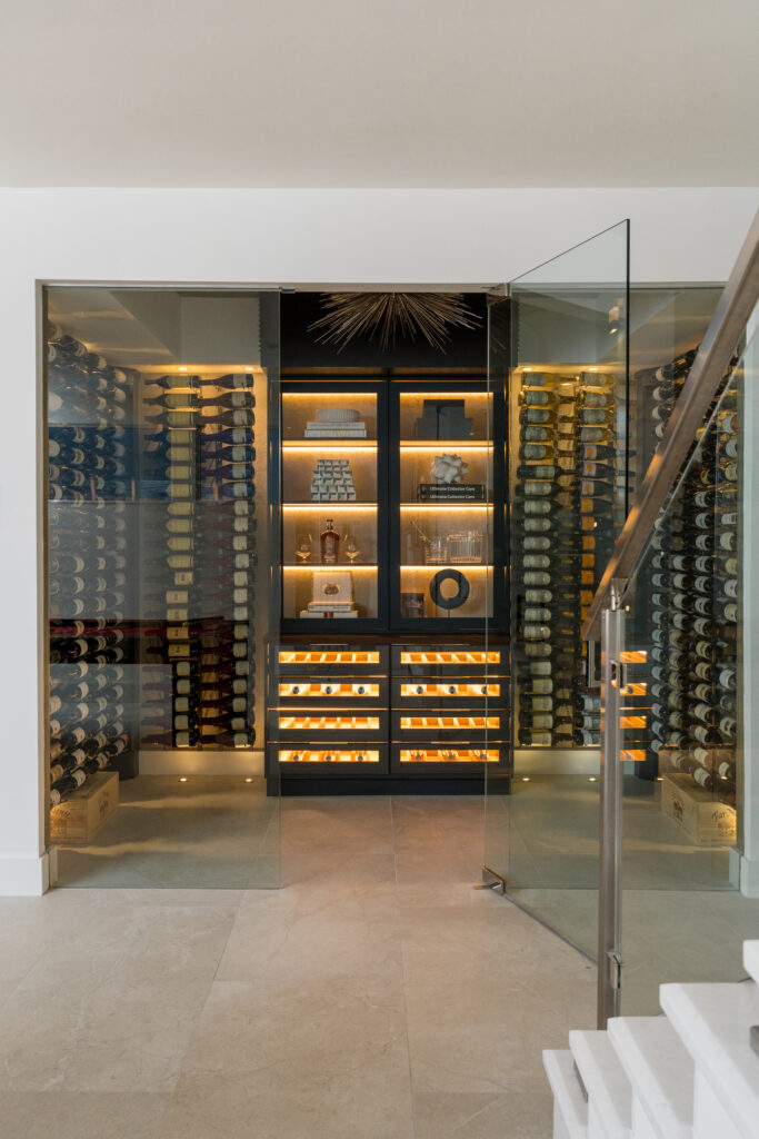 Throughout the house are artistic touches: unique mosaic tiles, rich, seductive colors, and custom cabinetry to hold the husband’s favorite things. Consider the wine room, which takes its inspiration from ice and rain. The wallcovering, in vinyl snakeskin-printed gold, by Phillip Jefferies, became a significant inspiration. “We needed it to be sleek and subtle to illuminate the space,” the designer says.