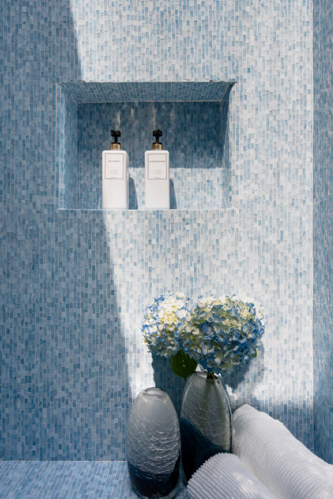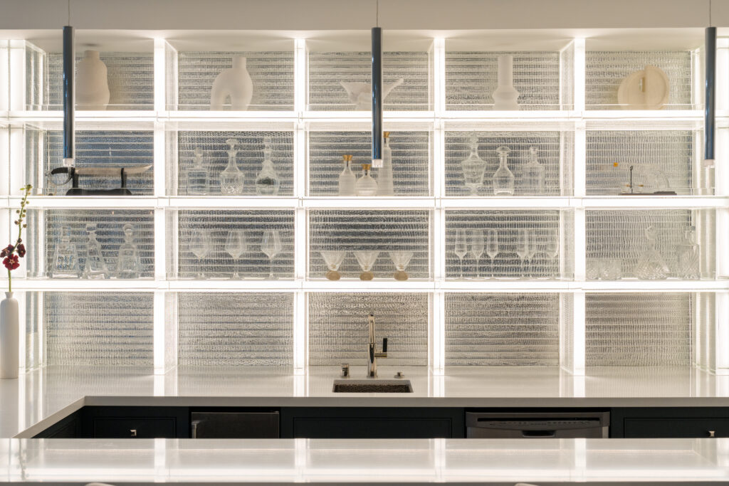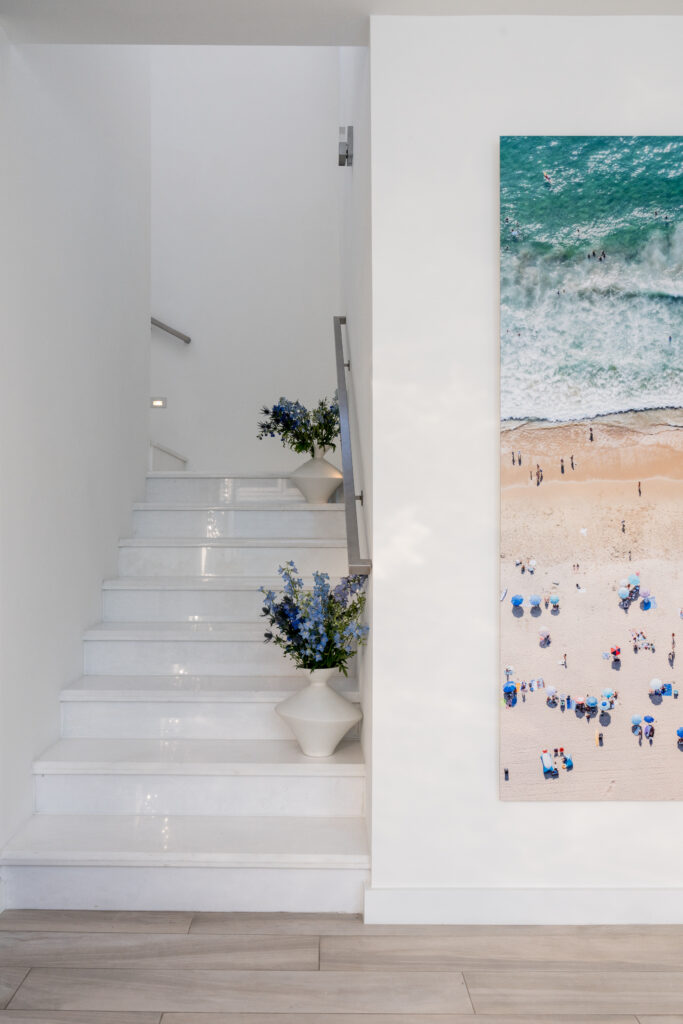 Vitale gave her full attention to each feature of the entertainment room, perhaps the most popular space in the house, located in Manhattan Beach. “Ice is pure, like glass,” Vitale says. When light streams through generous swaths of custom-casted windows, the glass blocks gleam. The Pacific Ocean, just beyond, lends its own gleaming shine on a sunny day. “When the light hits the space, it changes color,” Vitale says. This room, on the home’s ground floor, is just the beginning. The two floors above, which include the kitchen, living room, and other shared rooms, plus six bedrooms, await with their own magic.