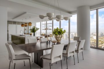 All three floors are geared to an elegant but casual beach lifestyle. The foyer’s sculptural staircase leads to the main living floor, where there is plenty of shared space for friends and family to gather. Furniture, much of it from 1st Dibs and upholstered in durable fabrics, establishes a clean-lined, cozy mood.