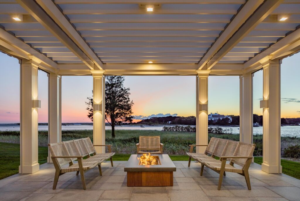 Outfitted with a pergola, a firepit terrace, an outdoor kitchen, and a swimming pool that was added as part of the renovation, the space is the entertainment hub of the estate.