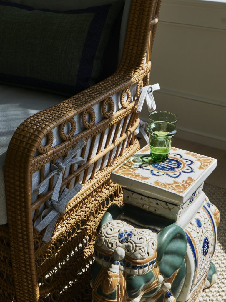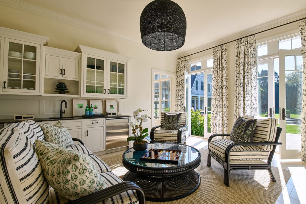Two major indoor-outdoor spaces key into the overall design theme as well. The sunroom has a sunny disposition thanks to a neutral palette and soft green accents. In comparison, the pool cabana has a more elegant air, with rattan furniture painted in black lacquer. Black repeats in the upholstery, pillows, and drapes, which offer a contemporary take on a traditional pattern.
