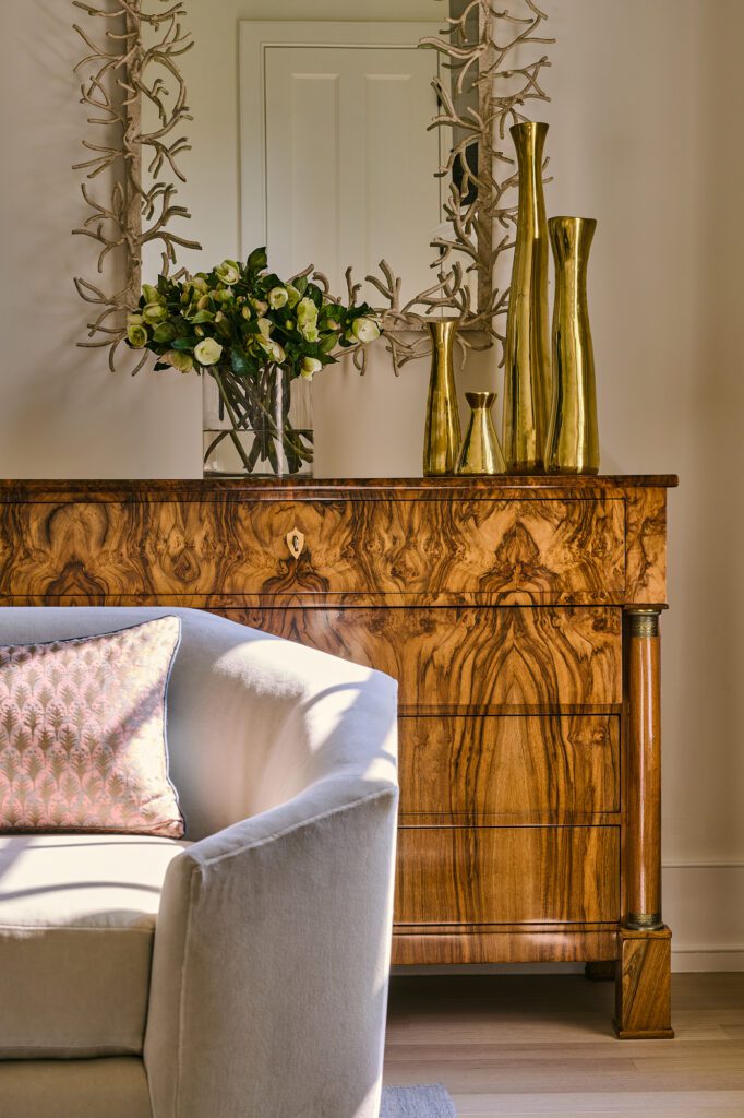 The living room introduces Babcock’s fresh palette and aesthetic. The first thing the eye sees is an abstract artwork in white and blue by Paul Kremer hanging over the fireplace. Meanwhile, contemporary sofas (one is snuggled into a recess), vintage French chairs, new coffee tables, and antique French nesting tables form two conversational seating sets. A vintage French standing brass lamp in the shape of an undulating bouquet of blooms and floral sconces bookending the Kremer are subtle reminders of the natural world outside.