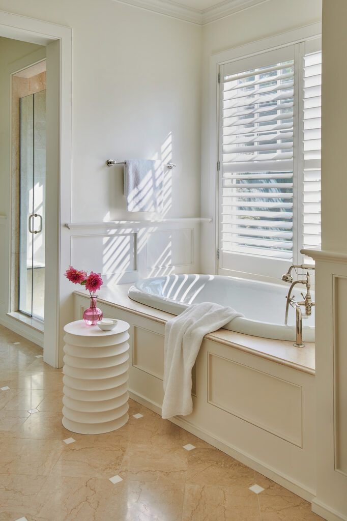 She repainted the interiors Benjamin Moore “Swiss Coffee” white, refinished the floors to lighten them, and refreshed the look with a juxtaposition of new and vintage furnishings. The result is an interior that communicates refined yet casual elegance.