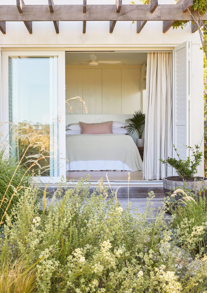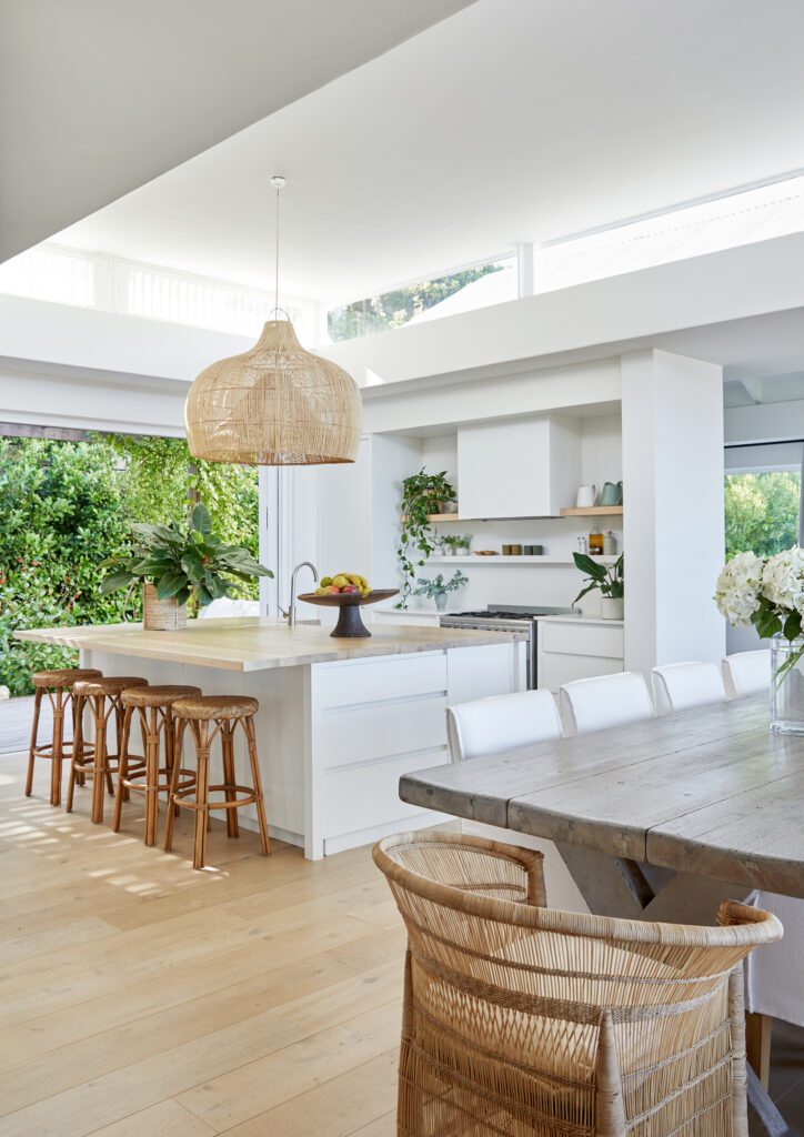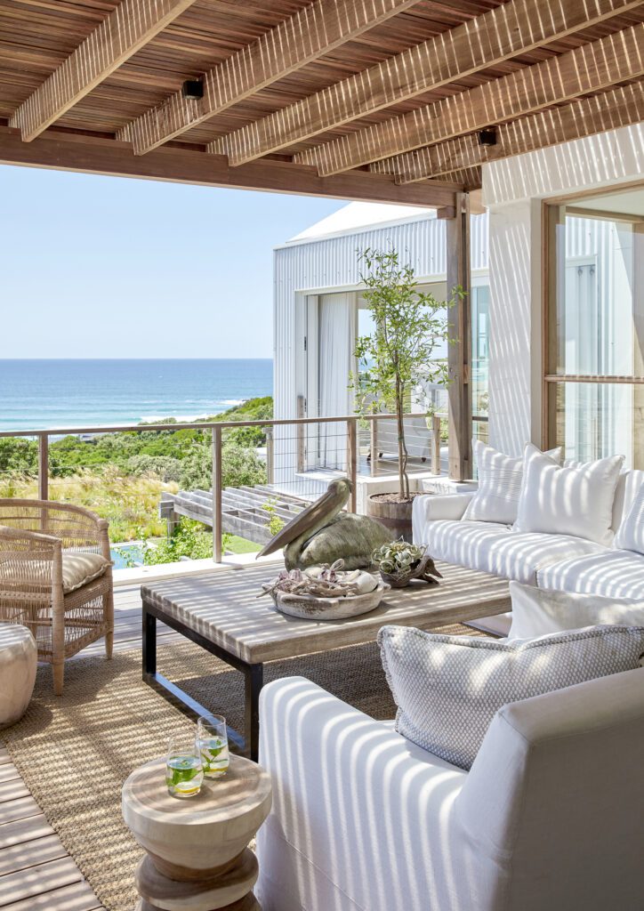 For the interiors, the couple enlisted their friend and decorator Jennifer Jones, who helped realize a palette of pale oak, tin, white, stone, and soft textures. “Jen sourced pale oak floors and helped bring in beams and cabinetry in the same tone,” Linda explains. “She also softened the aluminum doors with natural materials and layers of texture.” Many of the Robertsons’ existing furniture pieces found new life here, repurposed to suit the house’s effortless, coastal rhythm.