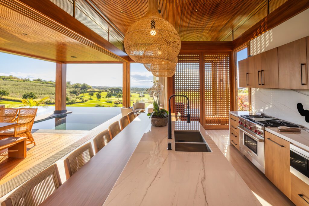 Floor-to-ceiling glass walls and sliding doors dissolve the boundary between indoors and out, framing uninterrupted views across the 8th hole, lush fairways, and the infinity-edge pool that appears to stretch toward the Pacific Ocean beyond. The covered lanaʻi functions as a true extension of the living space, anchored by a fully equipped outdoor kitchen and multiple seating areas designed for both entertaining and quiet retreat.