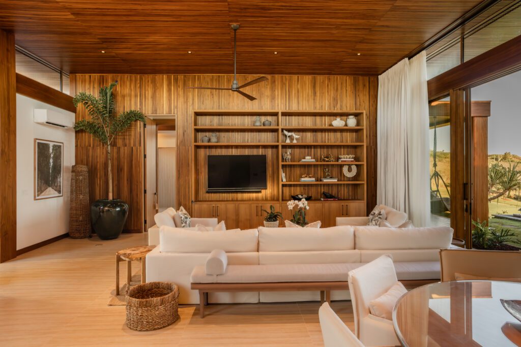 Soaring ceilings and expansive interior volumes create a sense of openness throughout the residence, while large-format tile flows seamlessly across the main living spaces and into four generously proportioned bedrooms. Custom wood slatting and carefully considered architectural detailing elevate the interiors into a realm of understated, barefoot luxury, timeless rather than trendy, and executed with exceptional craftsmanship.